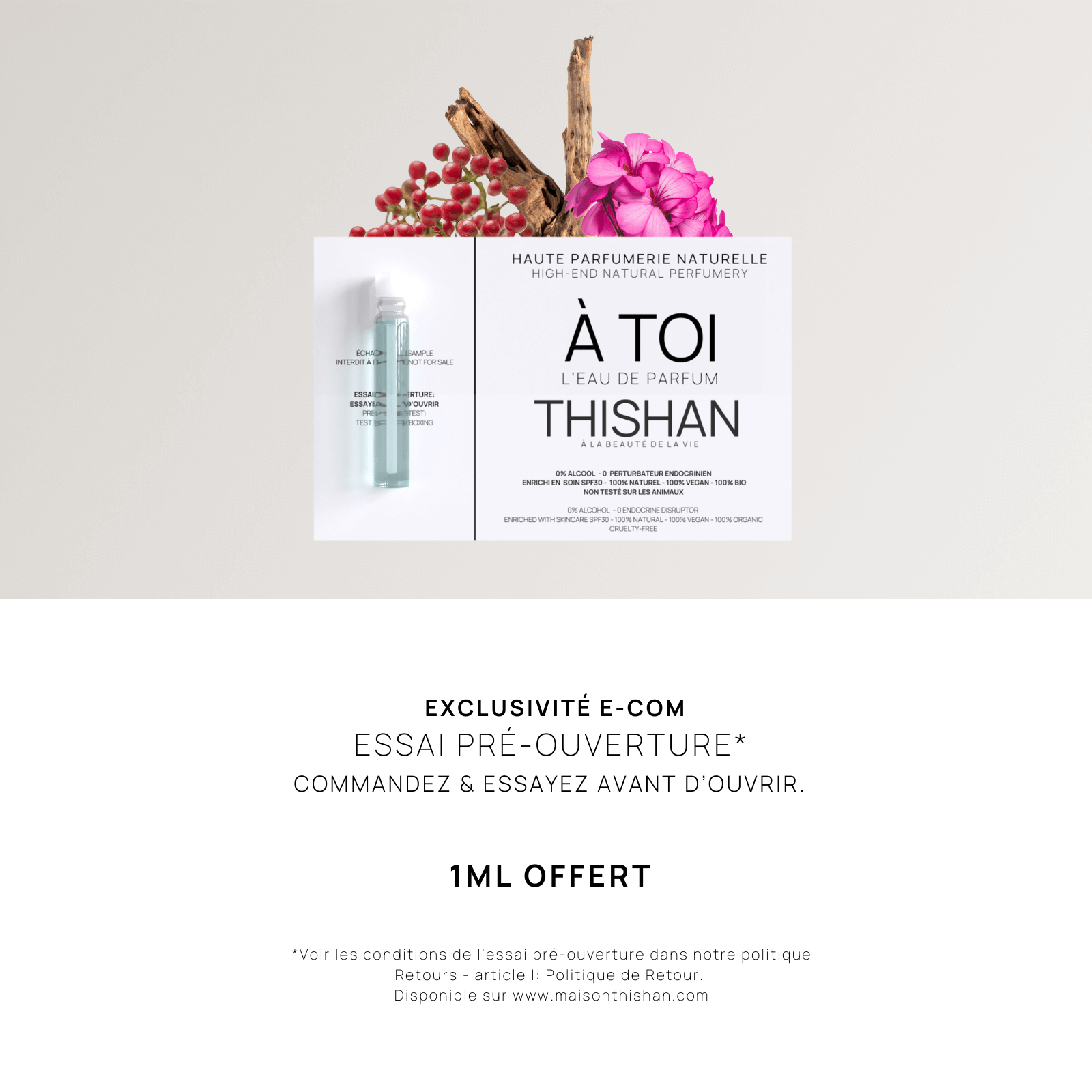 Le Parfum de niche THISHAN allie parfum, bien-être et soin : les matières les plus précieuses, sans alcool, sans perturbateur endocrinien, et enrichi en 2 actifs soin: vitamine E et SPF30. Une innovation respectueuse de votre peau et de vos cheveux.
